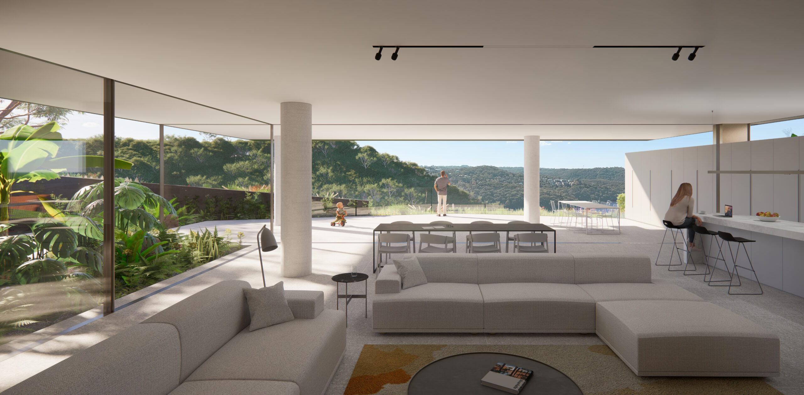 The ‘gap’ also reveals. Ground levels drop away to expose new primary accommodation located below the retained tennis court. Previous, poor quality below-court accommodation is cleared out, and a series of new columns introduced, creating a more spacious, singular undercroft for residents to inhabit. With daylight now permeating on three sides and abundant planting visible, fully retractable floor to ceiling glazing and flush thresholds see the living space spill out to a generous